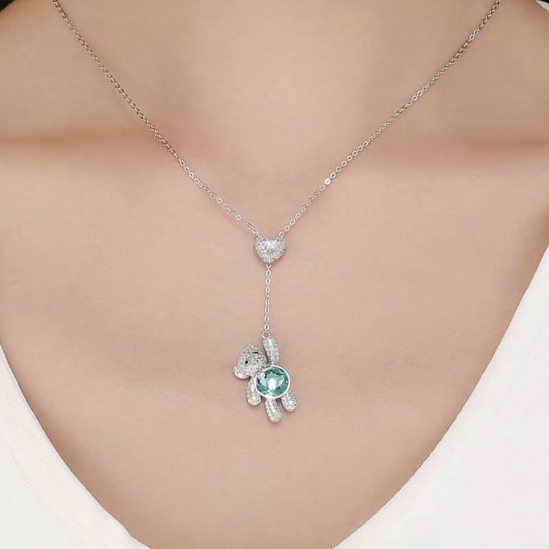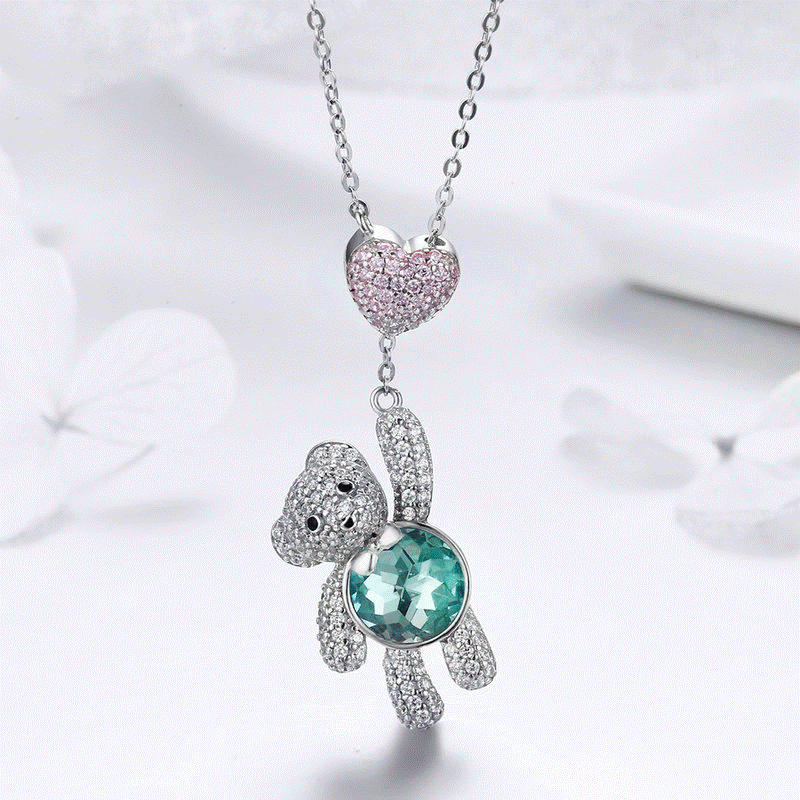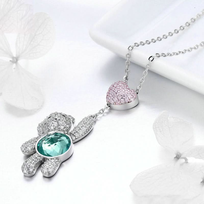 Wear the Bear Holding On Heart Necklace and add a whimsical touch to your style. This 925 Sterling Silver necklace features a bear being carried by a heart balloon & adorned with CZ diamonds. Exclusively available in silver. This beautiful necklace adds a whimsical touch to your outfit.