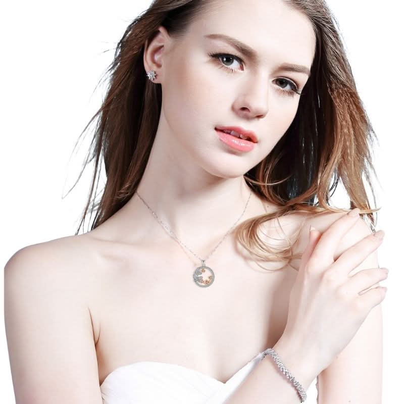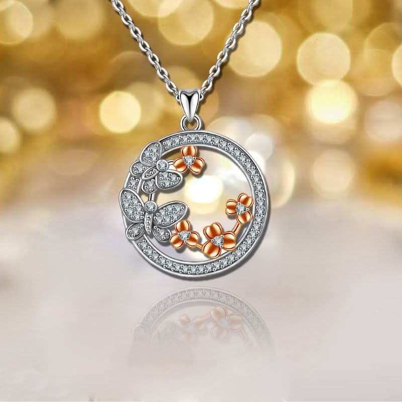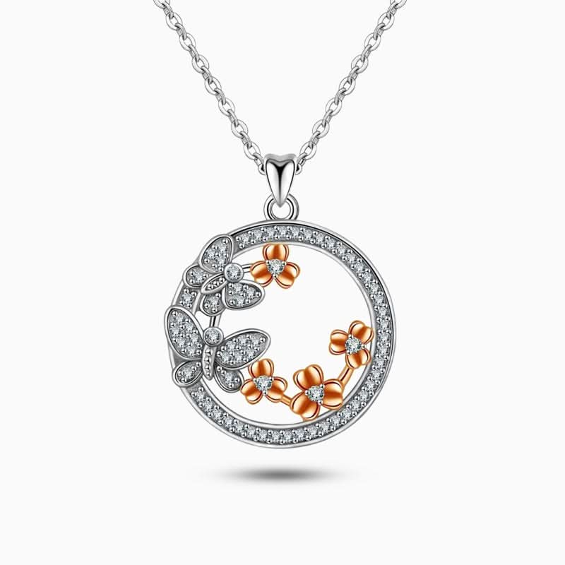 Our Blissful Butterfly Necklace embodies the aura of the playfulness of butterflies. It features a round pendant design with butterflies & rosegold flowers studded with gemstones for that beautiful sparkle. Exclusively available in silver. Wear it to add a bit of flirtatious flash to any outfit.