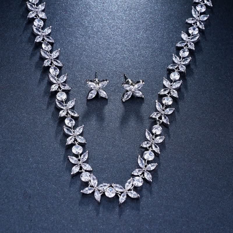 The beautiful Brilliant Flower Jewelry Set features a necklace and earrings, both adorned with dazzling zirconia crystals. Each piece of jewelry in this set features flower-like charms with four brilliant crystal points. Add this to your outfit for a special occasion and be ready to be the center of attention.