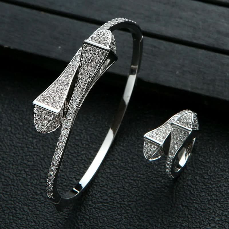 Add a touch of style and sophistication to your everyday look with the Dubai Contemporary Jewelry Set. Featuring a sparkling, resizable ring and a bangle adorned with a similar design, this is the perfect addition to any outfit. This set was inspired by the modern design and culture of Dubai, the city on the rise. Now available in gold and silver.