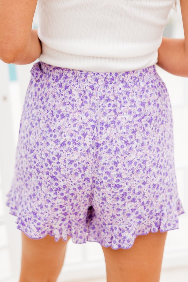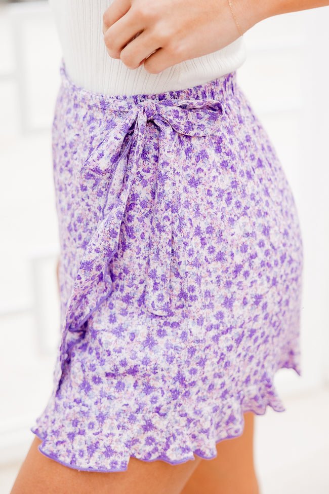 - Self tying side tie with mini length, faux wrap, and elastic waist in the back
